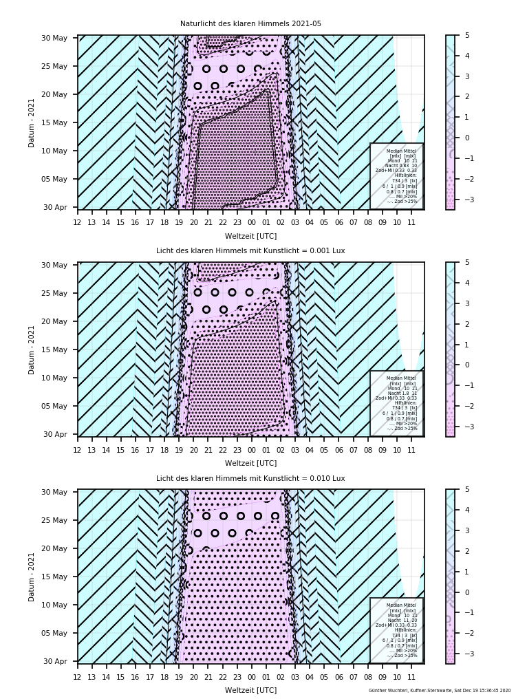 Naturlicht (oben), mit 0,001 lx Kunstlicht (Mitte, "ländlicher Siedlungsraum"), und 0,01 lx (unten, "Stadtrand" )